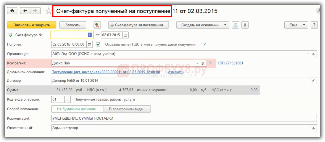 Рассмотрим, какие действия должны быть предприняты покупателем для исправления данного счета-фактуры в 1С 8.3.