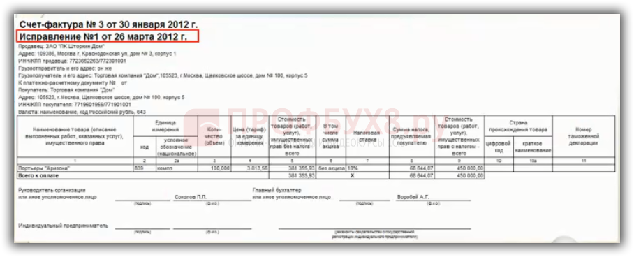Если ошибки или неточности допущены при оформлении счета-фактуры, то продавец обязан его исправить и предоставить исправленный счет-фактуру. В исправленном счете-фактуре обязательно в строчке 1а прописывается текущий номер исправления и число, месяц, год исправления: