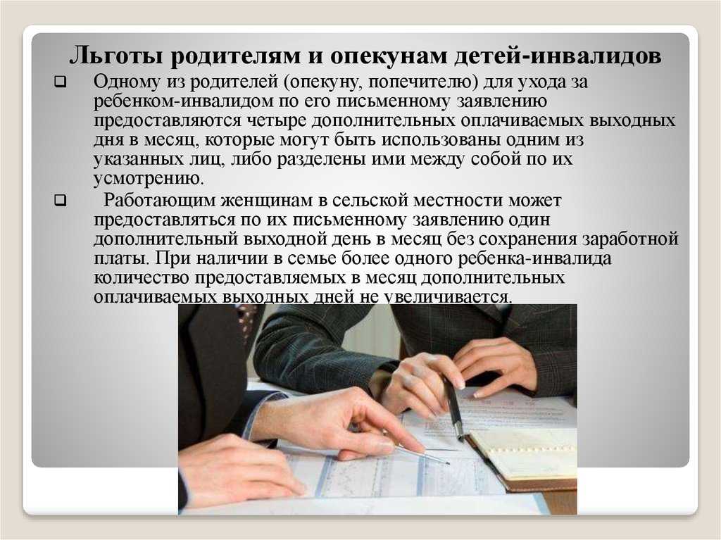 Право работающего родителя на четыре дополнительных выходных дня в месяц для ухода за детьми-инвалидами закреплено статьей 262 Трудового кодекса РФ. Выходные предоставляются на основании письменного заявления и могут быть использованы одним из родителей или же разделены между ними по их усмотрению. Это право также распространяется на опекунов и попечителей.
