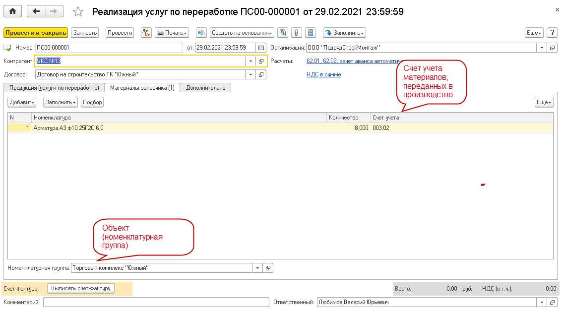 В строительной отрасли объектами передачи могут быть не только материалы (песок, кирпичи, цемент и т.д.), но и детали, конструкции, оборудование заказчика. Как сырьё, передаваемое на переработку, так и готовая продукция являются собственностью компании-заказчика.