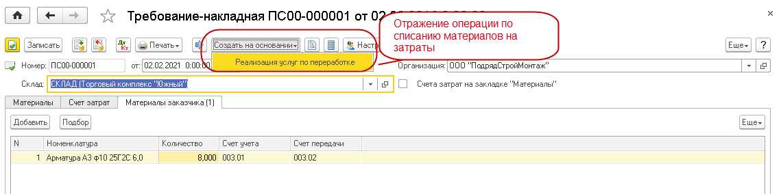- Следующий шаг – передача материалов в производство. На основании документа «Поступление: Материалы в переработку» создадим документ «Требование-накладная» – контрагент, склад и материалы подтянутся автоматически. Укажем объект строительства, на который передаются материалы (если учет ведется по объектам – соответствующую настройку выбираем в программе), и проводим документ.