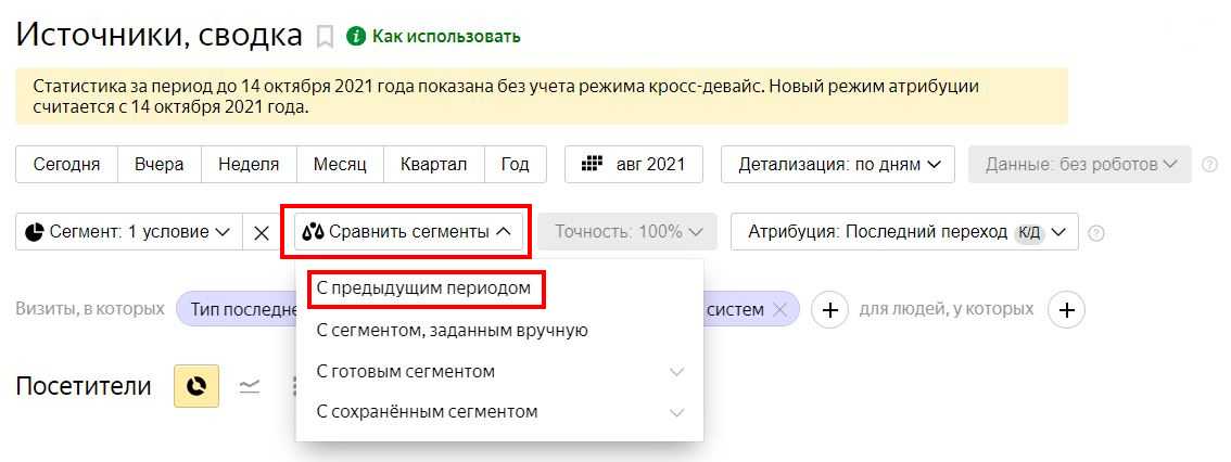 Кликните по кнопке «Сравнить сегменты» и выберите «С предыдущим периодом».