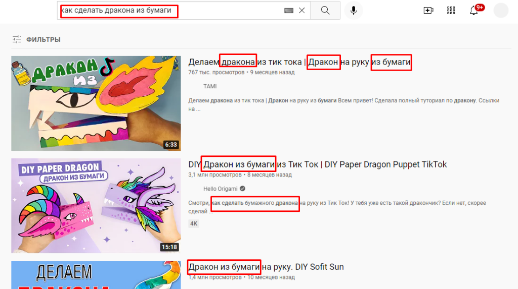 Пример, как работает SEO на YouTube: в описании и названии видео есть ключевые слова, поэтому ролики показаны по запросу