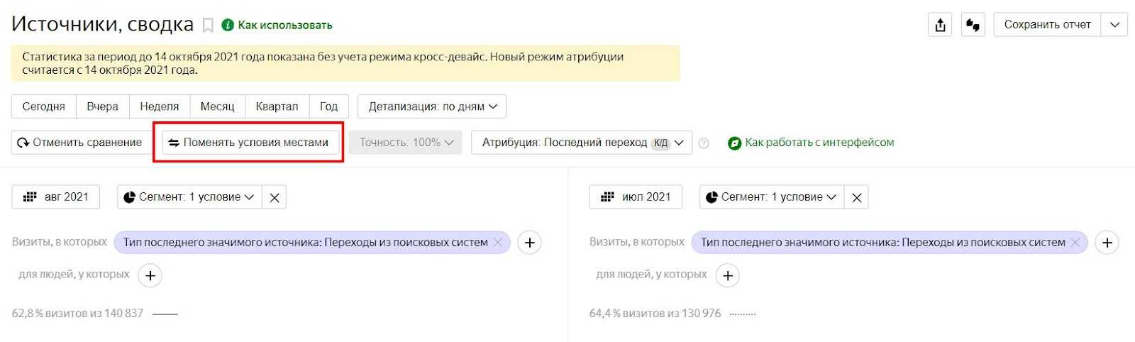 В итоге слева вы можете наблюдать данные за текущий период, а справа — за предыдущий. Это может быть не очень удобно с точки зрения восприятия: прирост трафика за август выглядит как просадка с июля.