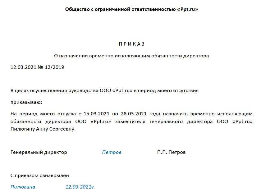Основной распорядительный документ в такой ситуации — это приказ. В случае назначения врио его составляет кадровик, а подписывает руководитель. Но как быть, если место руководителя вакантно? Здесь все зависит от организационной формы компании.