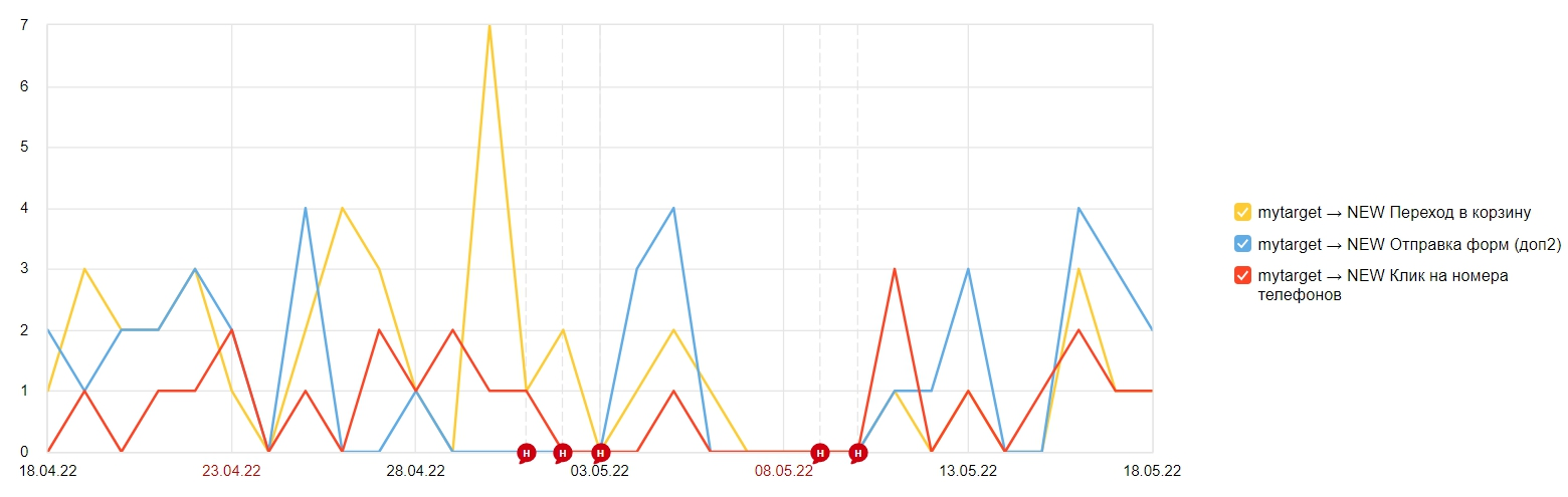 Как и в ВК, на большинстве площадок рекламный кабинет предлагает не только прогнозы по охвату и цене клика, но и позволяет оценить итоги кампании. Например, в myTarget можно вывести на график конверсии в зависимости от даты.