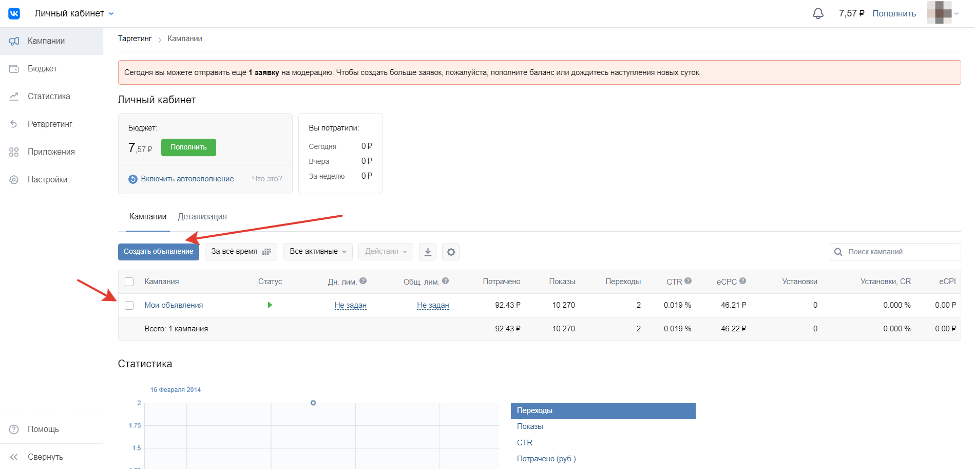 Рассмотрим на примере площадки ВКонтакте. Зайдите в рекламный кабинет, создайте новую кампанию по кнопке «Создать объявление» или используйте существующую.