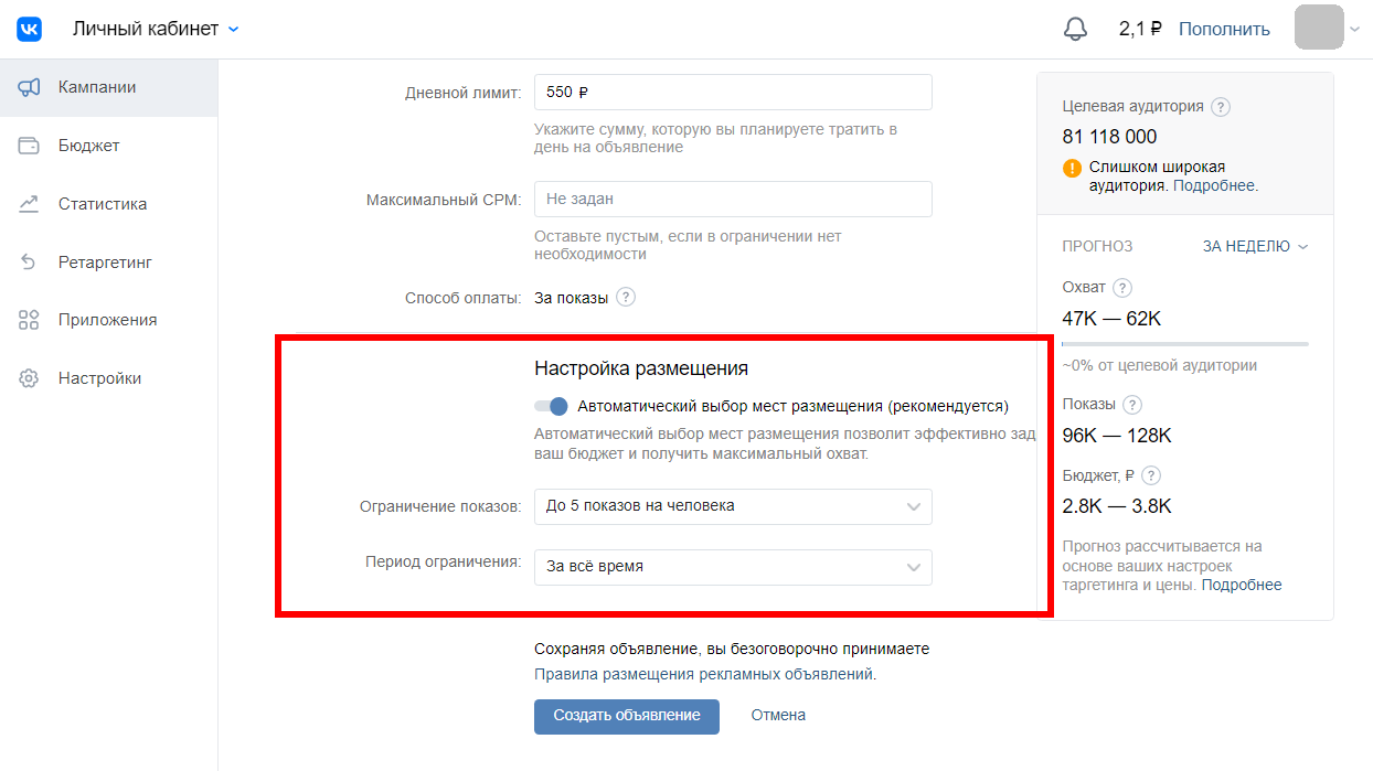 В разделе «Настройки размещения» вы задаете частоту показов — сколько раз объявление увидит один и тот же человек. Желательно держать это значение в пределах 1–3.
