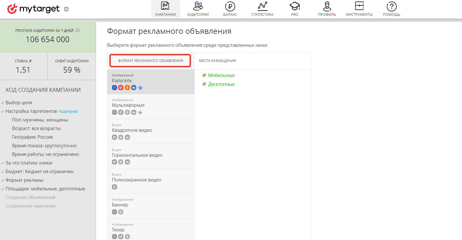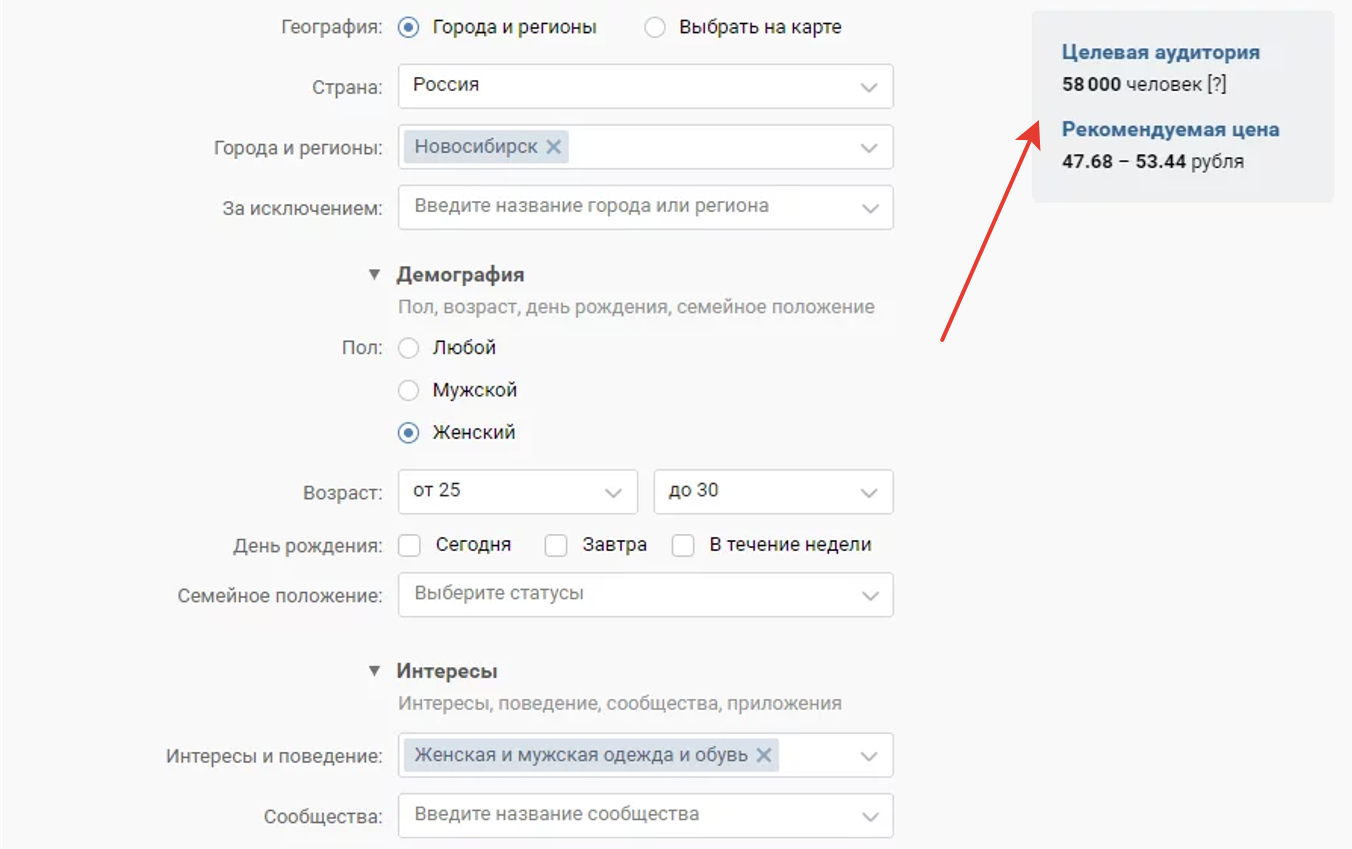 После выбора формата рекламы и создания объявления вы настраиваете таргетинг учитывая: возраст, пол, интересы, географию и другие параметры ЦА. Когда вы зададите эти параметры, платформа сама подскажет вам, какой ожидается охват и какие ставки за клики или показы рекомендует система.