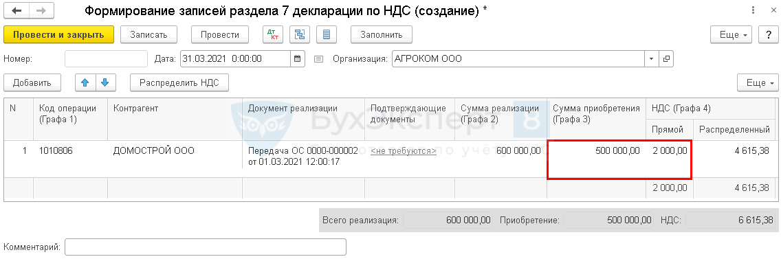 - Графа 4 — НДС Распределенный из документа Распределение НДС.