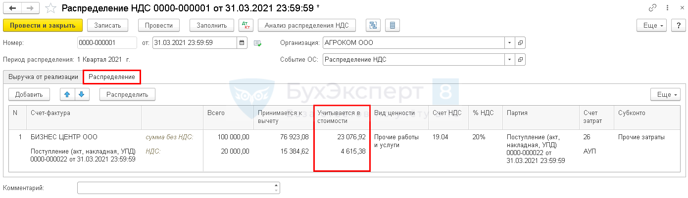По окончании квартала создайте документ Распределение НДС в разделе Операции — Регламентные операции НДС.