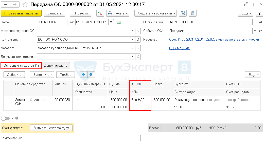 Реализацию земельного участка оформите документом Передача ОС в разделе ОС и НМА — Передача ОС.