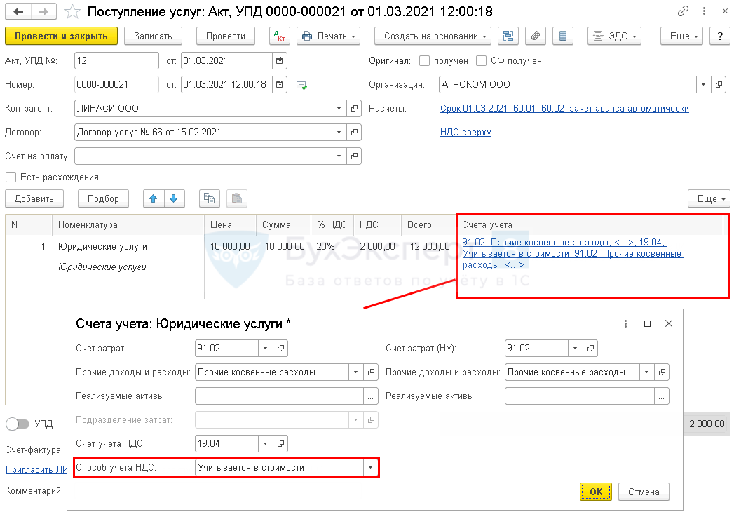 Поступление юридических услуг оформите документом Поступление (акты, накладные, УПД) вид операции Услуги (акт, УПД) в разделе Покупки — Поступление (акты, накладные, УПД).