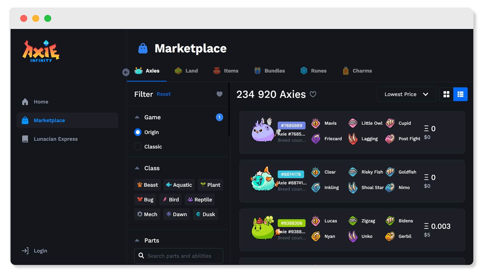 Axie Infinity работает на блокчейне Ethereum и дает игрокам возможность зарабатывать на продаже NFT и токенов. А чтобы начать в нее играть, нужно потратить около $500 на покупку своих первых существ Акси.