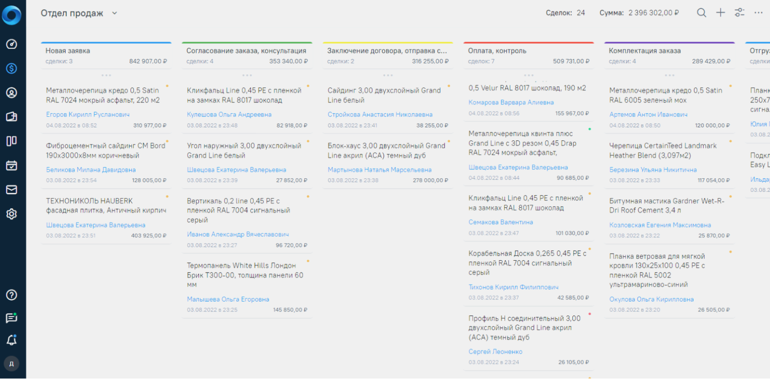 Система собирает все заявки и заказы в общей воронке продаж, пишет сообщения клиентам, отправляет документы и автоматически звонит заказчику. На разных этапах воронки можно настроить свои автоматические действия.