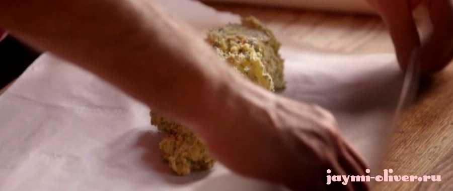 - Выложить на лист для запекания, застеленный пергаментом и слегка смазанный подсолнечным маслом.