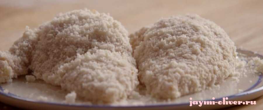 9. Тем временем подготовить льезон — взбить свежие яйца с щепоткой соли. Муку и панировочные сухари высыпать в разные сухие блюдца. Достать охлажденные будущие котлеты по-киевски из холода и хорошо обвалять сначала в муке. Затем обмакнуть в яичную массу, чтобы она полностью «смочила» всю поверхность заготовки. Опустить в панировку и тщательно обкатать, чтобы создался хороший ровный хлебный слой.