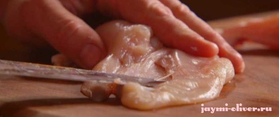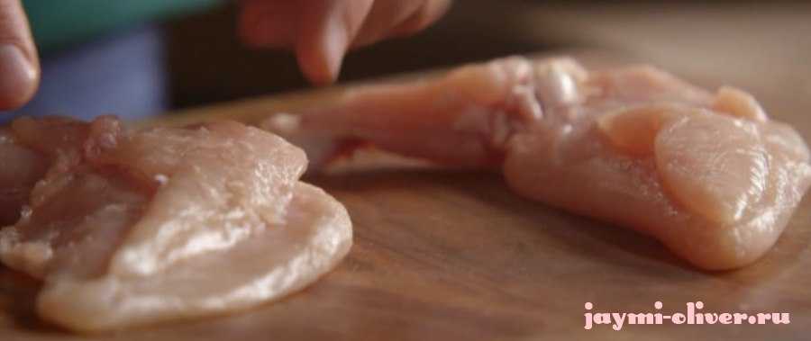 - Филе курицы (каждый кусок) разрезать вдоль на 2 части, отбить кухонным молоточком, предварительно накрыв пищевой пленкой.
