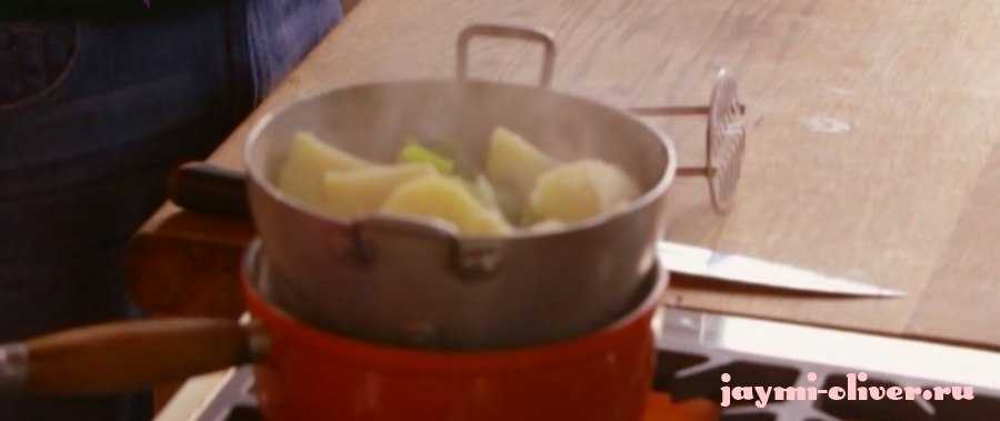 11Вывалите сваренный картофель и брокколи в дуршлаг, затем поставьте его на кастрюлю и дайте подсушиться на пару. Добавьте кусочек сливочного масла и раздавите все в пюре. Положите щепотку соли и перца.