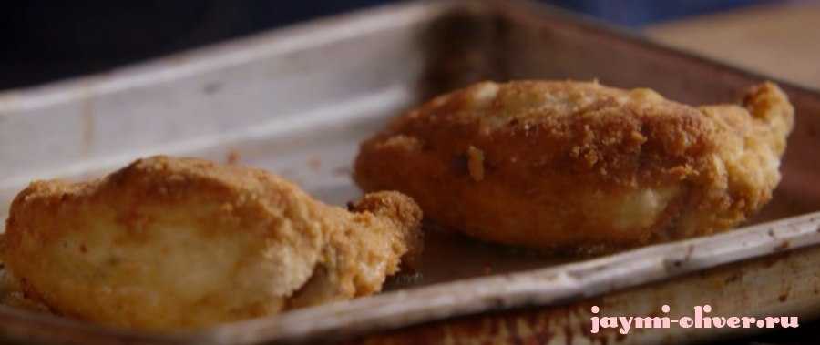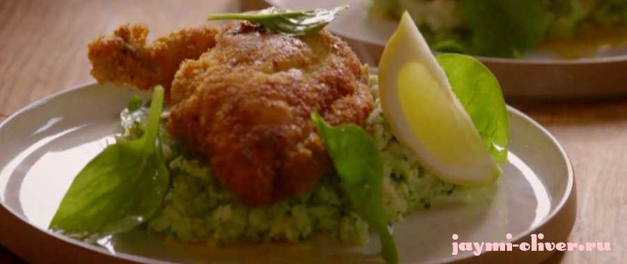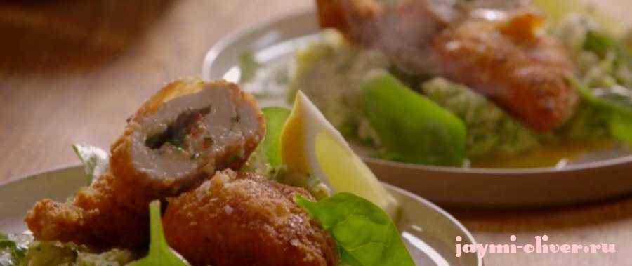Котлеты по-киевски редко встретишь в английском меню, но для Джейми Оливера это добротная курица, обваленная в сухарях, начинённая чесночным маслом и хрустящим беконом — замечательное блюдо в стиле ретро и его вкусом стоит насладиться. Оформление действительно отличное и неизбежно приведет к улыбкам на лицах людей.