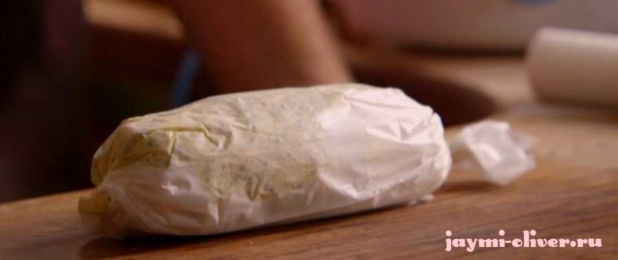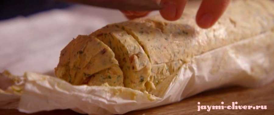 Для большего удобства хранения и легкости нарезки, Джейми всегда раскатывает чесночное масло в форму в виде колбасы.