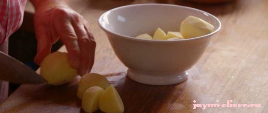 9Тем временем, почистите и крупно нарежьте картофель и варите в большой кастрюле с кипящей подсоленной водой в течение 12-15 минут, или до готовности.