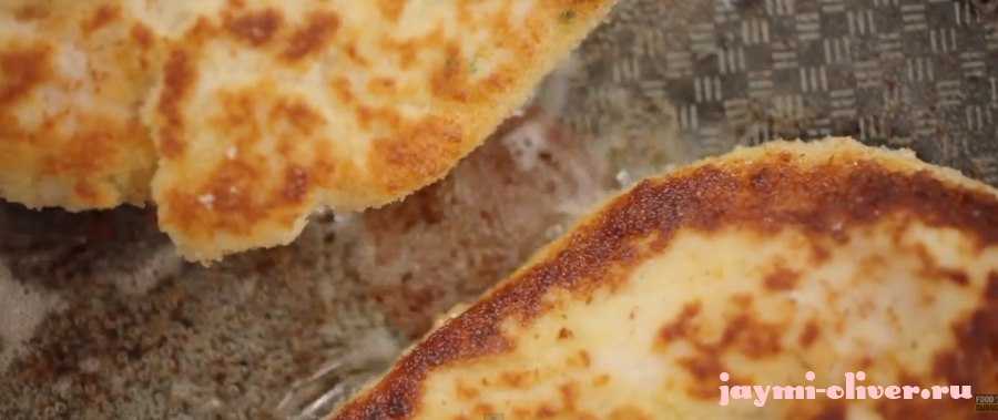 10. Желательно отправить подготовленные заготовки еще на полчаса в прохладное место, чтобы внешний слой получше схватился. Вылить подсолнечное масло в глубокую сковороду, разогреть до легкого потрескивания и опустить в него наших «красавиц». Обжаривать по 5 минут с каждой стороны, а затем еще на 10-15 минут отправить в разогретую до 180 градусов духовку.