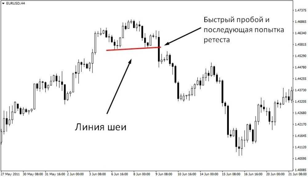 Это своеобразный сигнал, который нужен трейдерам для открытия сделки. На этом этапе требуется увидеть и зафиксировать момент, когда цена начнет пробивать линию шеи. Для этого существуют 4 метода: