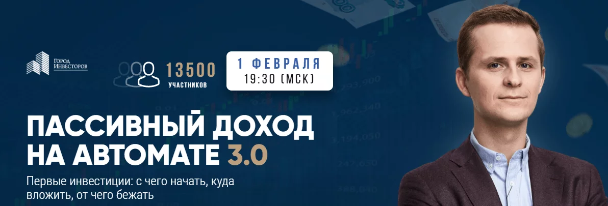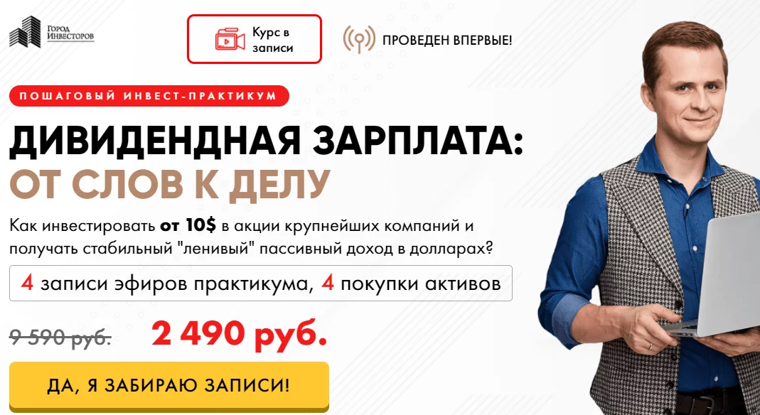 «Пассивный доход на автомате». Стоимость участия составляет 1490 рублей (старая цена 14000 рублей). Курс для начинающих инвесторов, в рамках которого ссылаясь на отзывы, пользователи узнают с чего начать и куда вложить на старте, а также каких инвестиций лучше избегать . Программа курса длится 10 дней, ведущими семинара являются Евгений Ходченков и Сергей Бриз. Оплатить курс можно как банковской картой, так и при помощи электронных кошельков.