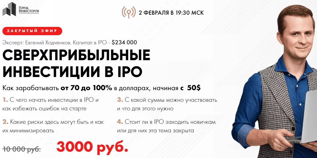 «Сверхприбыльные инвестиции в IPO». Стоимость участия в курсе – 3 тысячи рублей (старая цена – 10 тысяч руб.). Начинающих инвесторов обучат как зарабатывать от 70 до 100% в долларах, вкладываясь в IPO, а также как пишут в отзывах, расскажут о самых распространенных ошибках в этом виде заработка. Минимальный депозит для применения курса на практике – 50 долларов, по крайней мере, так указано в описании продукта. Эфир ведет Евгений Ходченков, плата указана за одно участие, продолжительность курса – 3-3.5 часа.