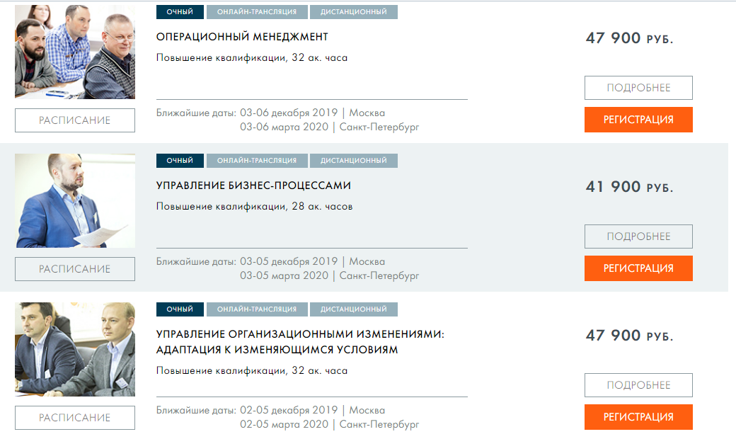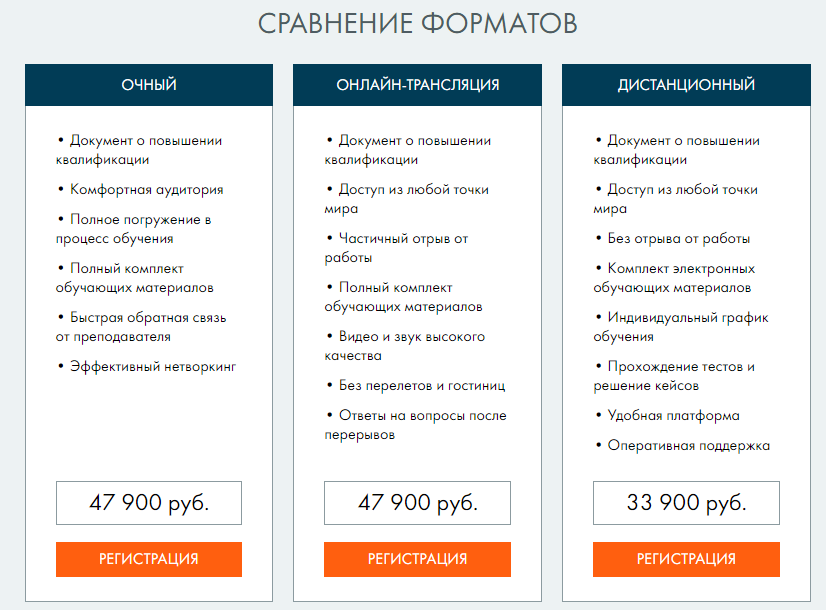 Обучение в очном формате дороже — в среднем такие курсы стоят 55-70 тыс. руб. Столько же нужно заплатить за доступ к онлайн-трансляции. Дистанционное обучение предполагает самостоятельное изучение студентов учебных материалов с возможностью обратиться к преподавателю с вопросами, домашними заданиями и обязательным экзаменом по завершении программы. Длительность курсов составляет 1-4 недели.