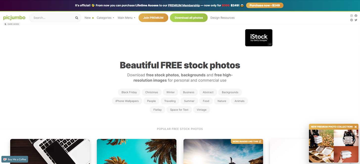 - Есть премиум-пакет: пожизненное членство $249 с бонусами. 150+ готовых коллекций изображений, собранных в тематические подборки, доступ к 10 000 эксклюзивным фото и даже авторские шрифты.
