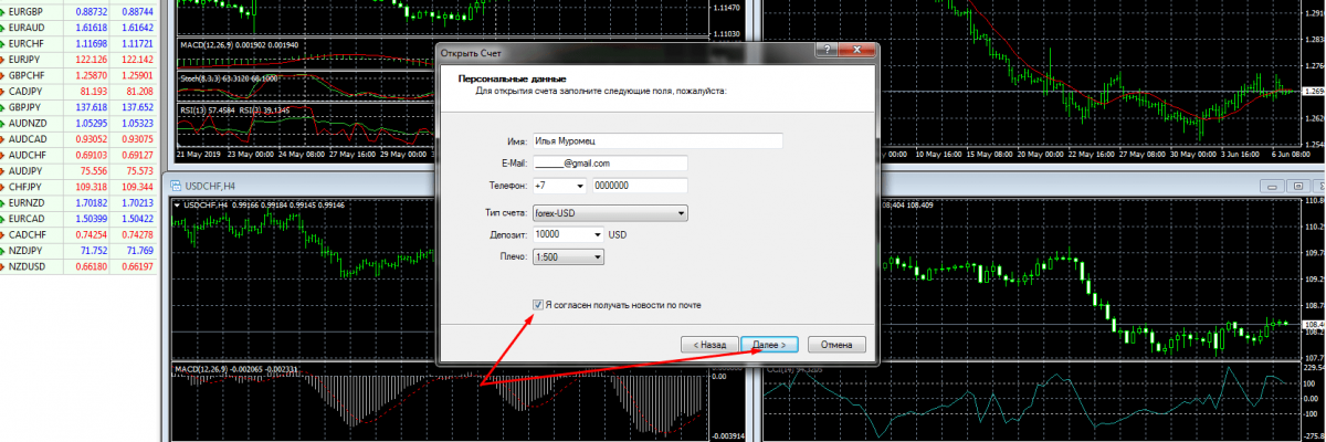 Для открытия демо-счета нужно зайти в подменю «Файл — Открыть счет» и выбрать в появившемся окне пункт «Новый демо-счет». В следующем окне указываем личные данные, выбираем базовую валюту счета, размер депозита и кредитное плечо. Обязательно ставим галочку в поле «Я согласен получать новости по почте», затем нажимаем «Далее».