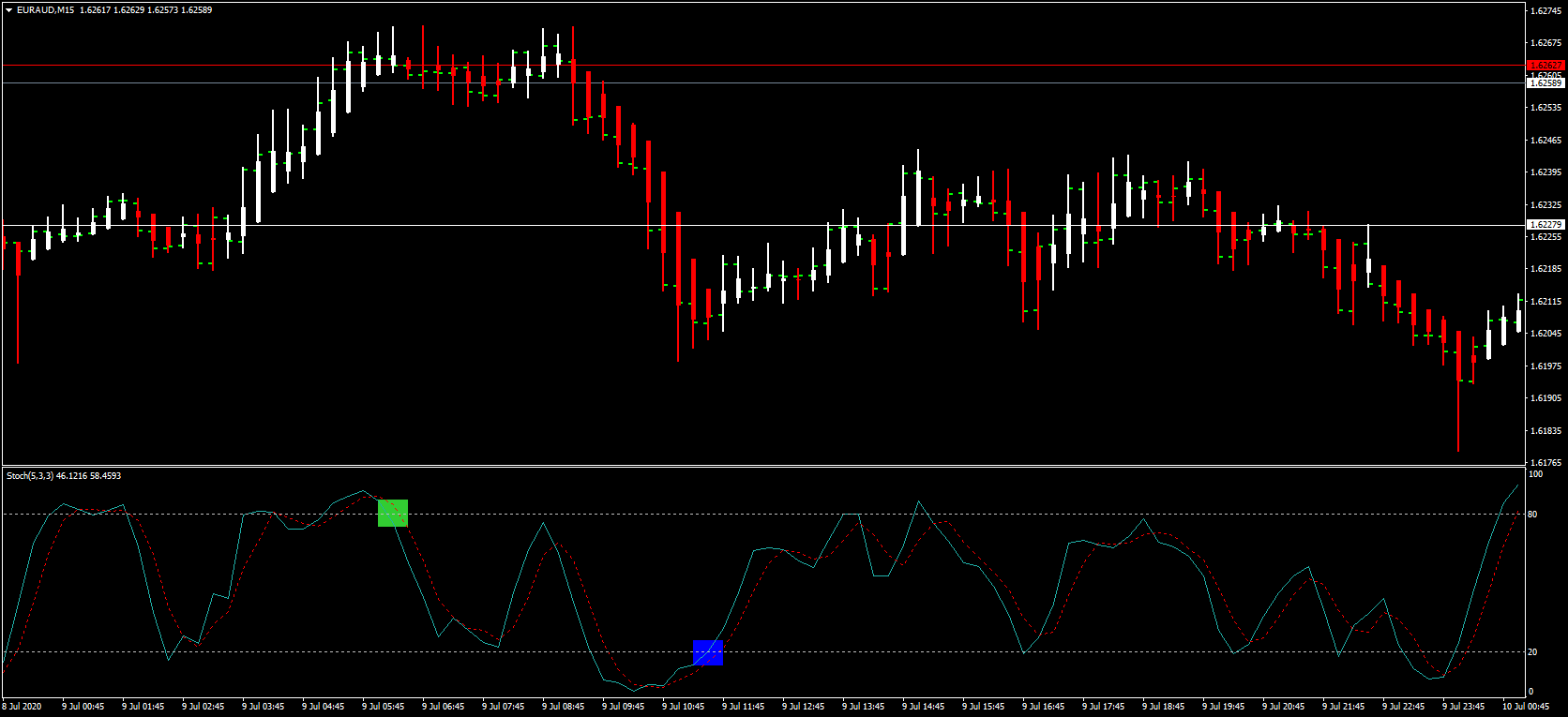 Когда сигнальные линии индикатора входят в зону перепроданности – это сигнал приготовится. Когда же линия из зоны перепроданности выходит опять в зону 20-80 – это сигнал на покупку. Соответственно, сигнал на продажу – когда сигнальная линия выходит из зоны перекупленности.