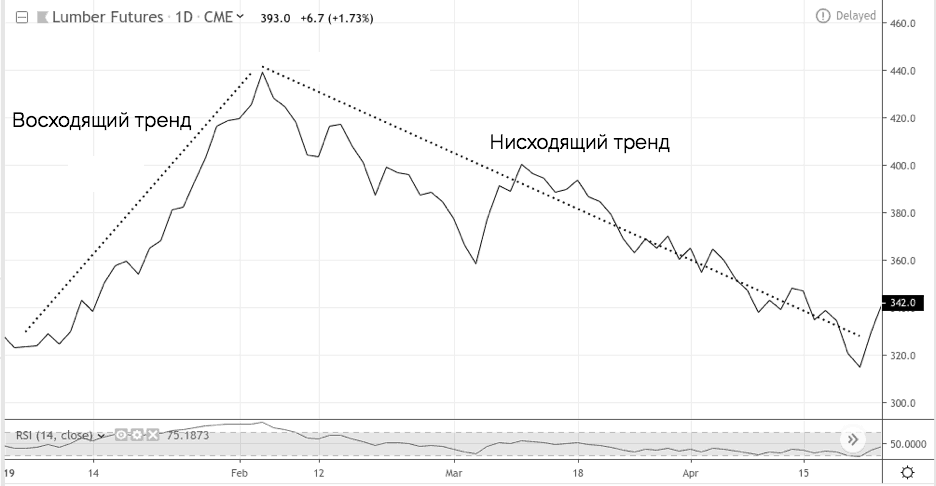 Этот график выглядит довольно легким для понимания, так как происходит только два основных движения — резкий восходящий тренд и более длинный нисходящий тренд.