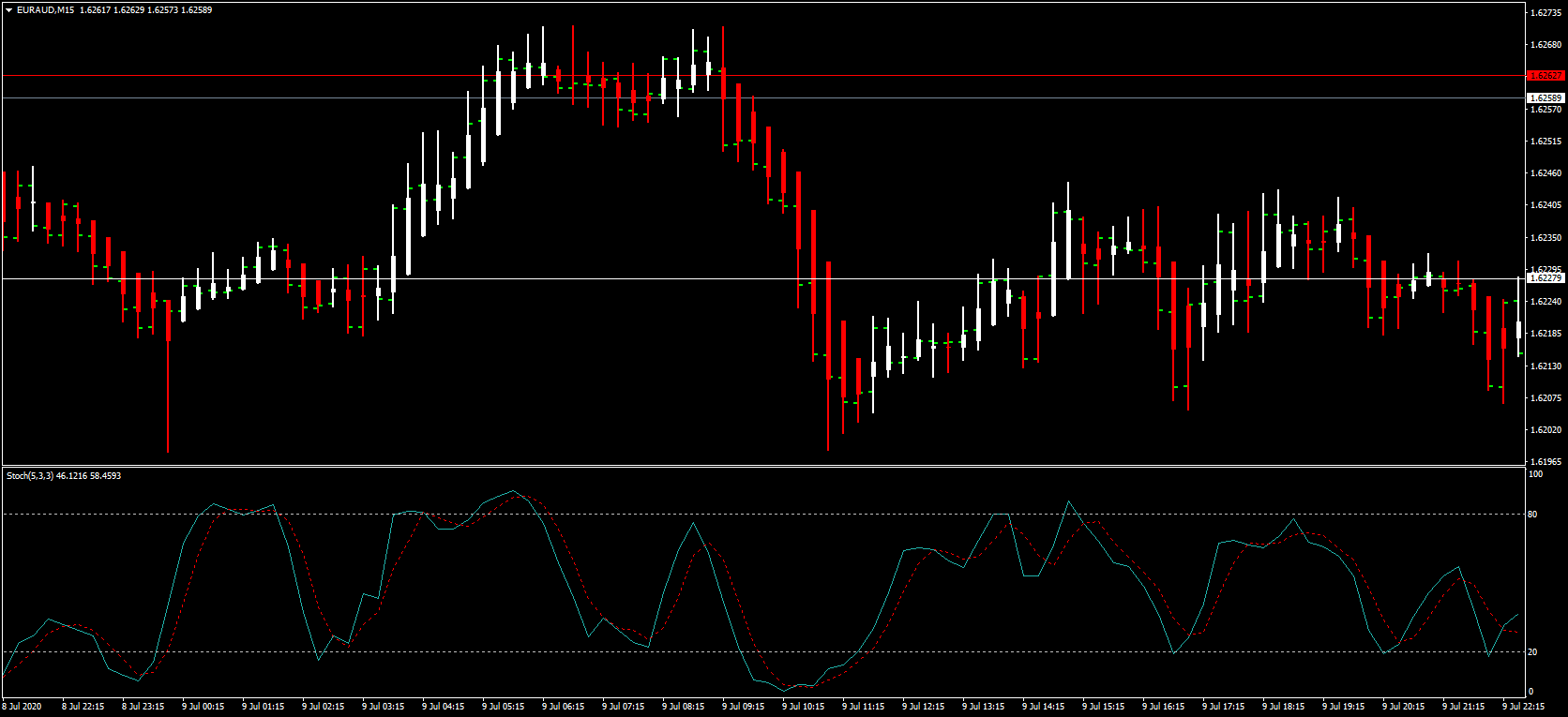 Комбинация со стандартным Стохастиком также вполне жизнеспособна на основных валютных активах. Разворот из критических зон осциллятора будем считать первым (предупреждающим) сигналом, а открываем сделку после того, как цена уверенно уходит выше/ниже линии HA-баров.
