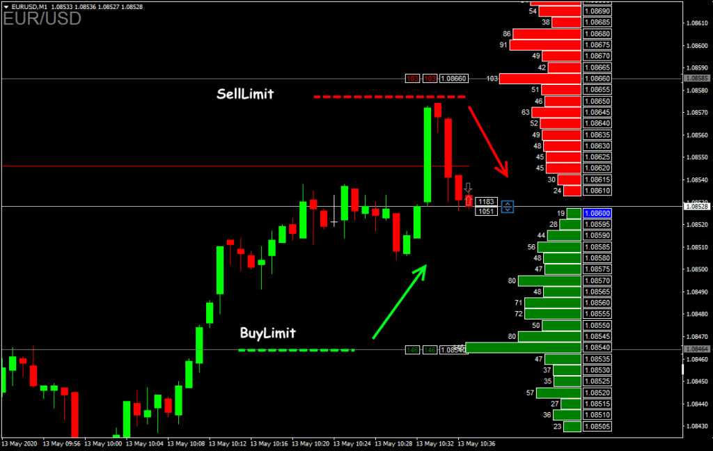 Наша цель – увидеть накопление лимитных ордеров на сильных уровнях, прежде всего, на достаточно свежих max/min баров М1-М15 с запасом в 10-30 пп.