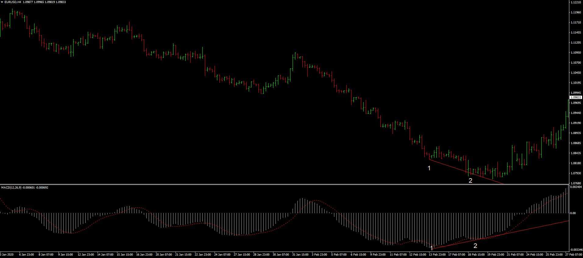 В данном случае, между движением цены и осциллятора появилось несоответствие — цена обновляет минимумы, а гистограмма MACD фиксирует их повышение. Вскоре, понижательный тренд начинает разворачиваться вверх.
