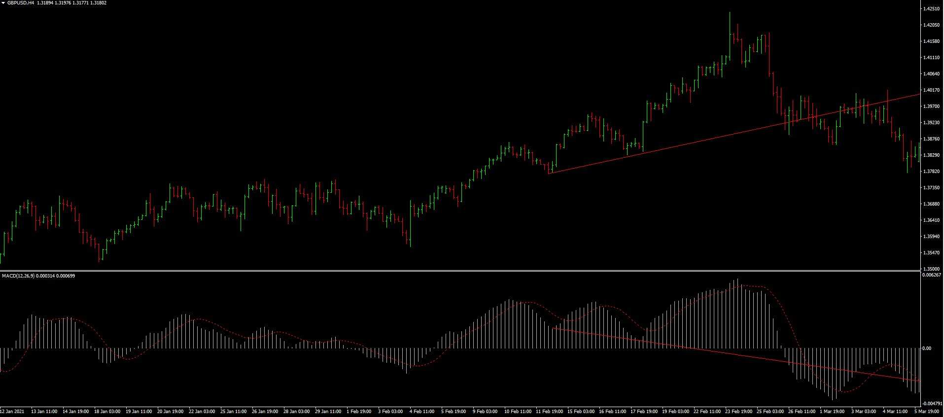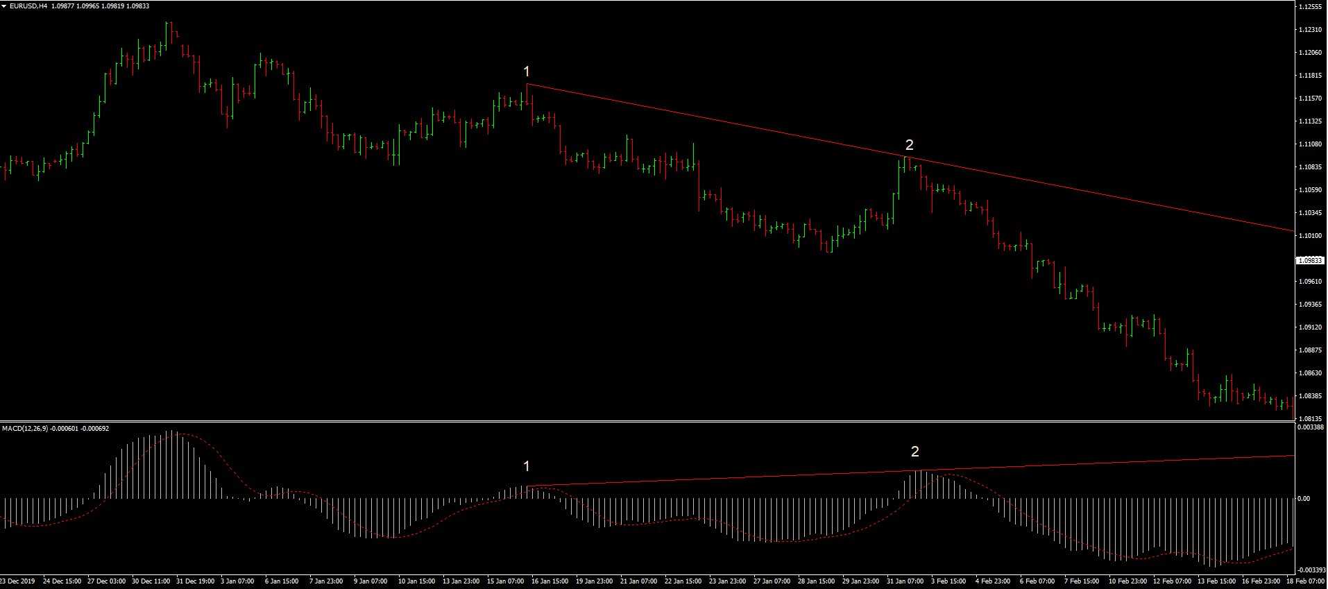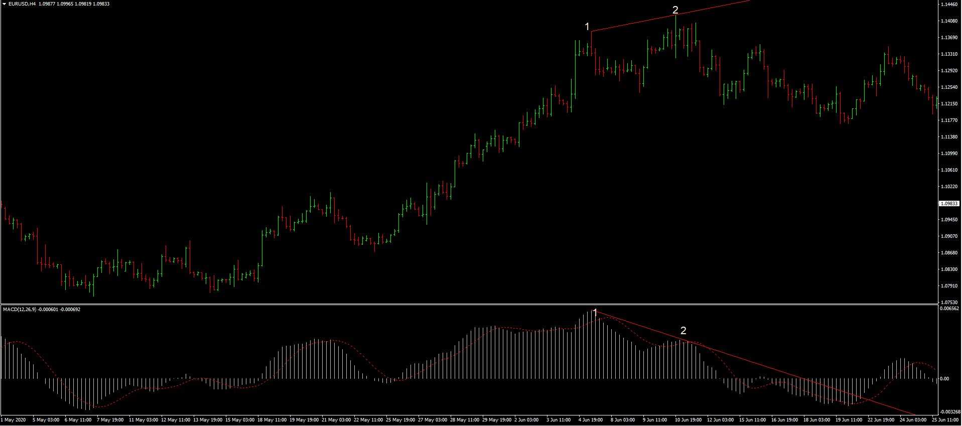 Пример дивергенции, валютная пара EURUSD и индикатор MACD — ценовые максимумы повышаются, пики на гистограмме — снижаются.