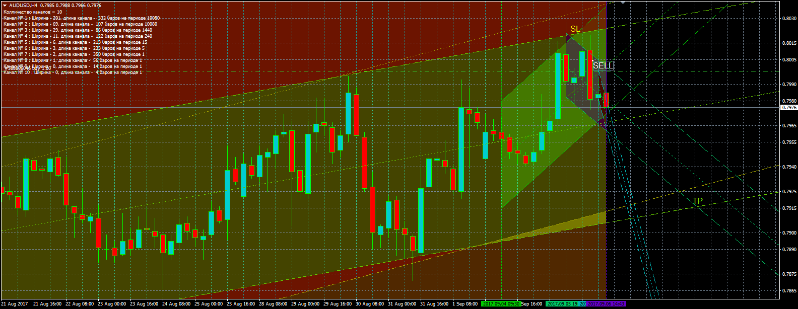 Здесь на часовом графике наметился канал разворота вниз от отметки 0,8022, на которую устанавливаем защитный стоп-ордер. Канал отличается шириной и имеет небольшой угол наклона. На четырехчасовике образовалось два коридора – один широкий под небольшим углом и второй узкий с углом наклона приблизительно в сорок пять градусов. Продаем от верхней точки узкого нисходящего канала на 0,7999, а тейк-профит устанавливаем на пересечении линий широкого нисходящего канала с дневным восходящим по 0,7916.