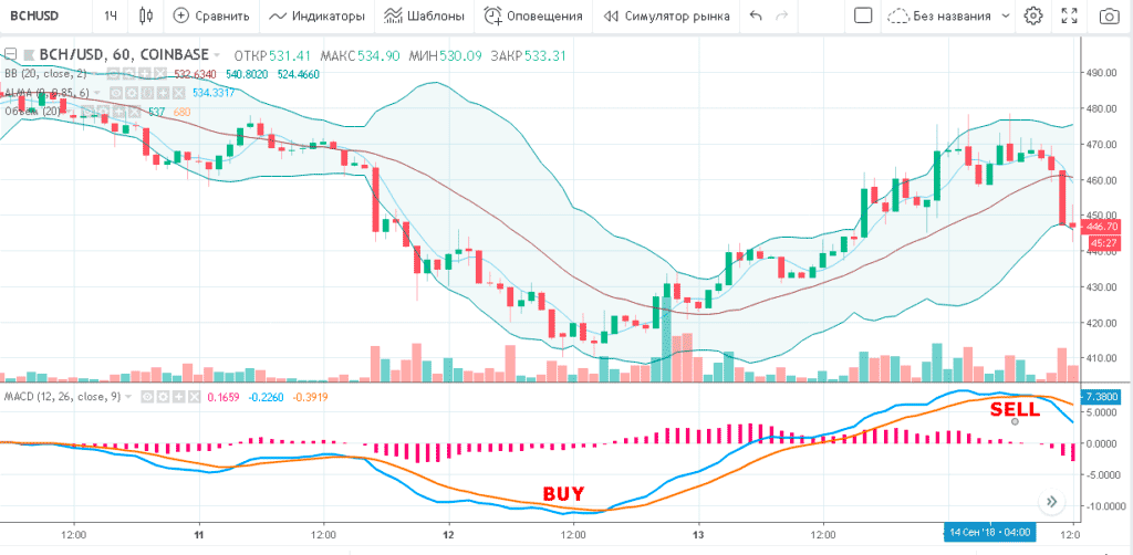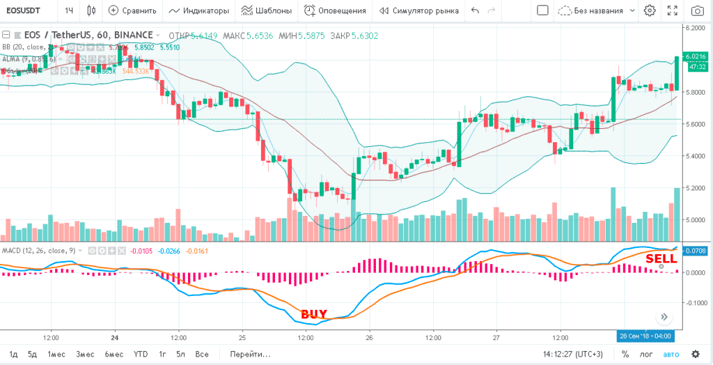Рассмотрим три графика, на которых индикатор MACD сработал и дал возможность закупиться криптовалютой на дне и продать ее на пике.