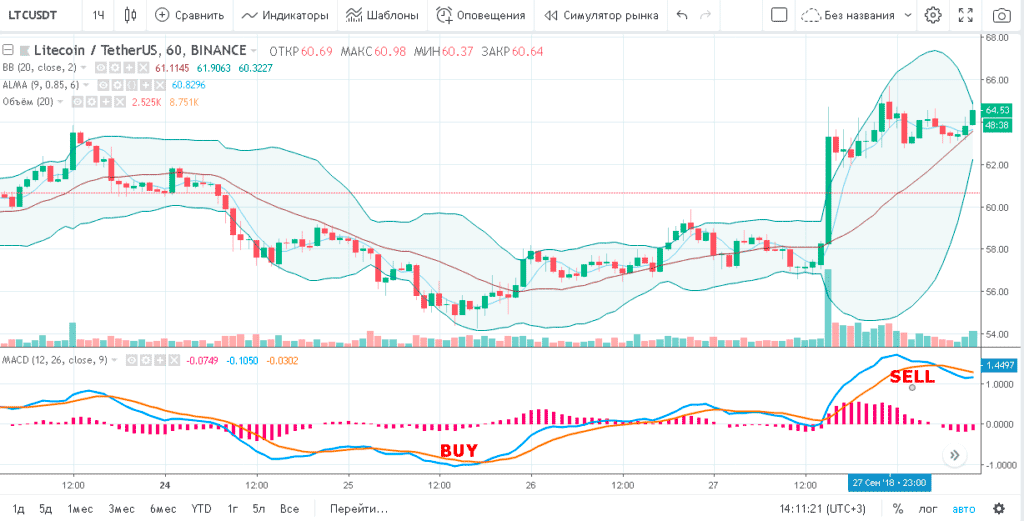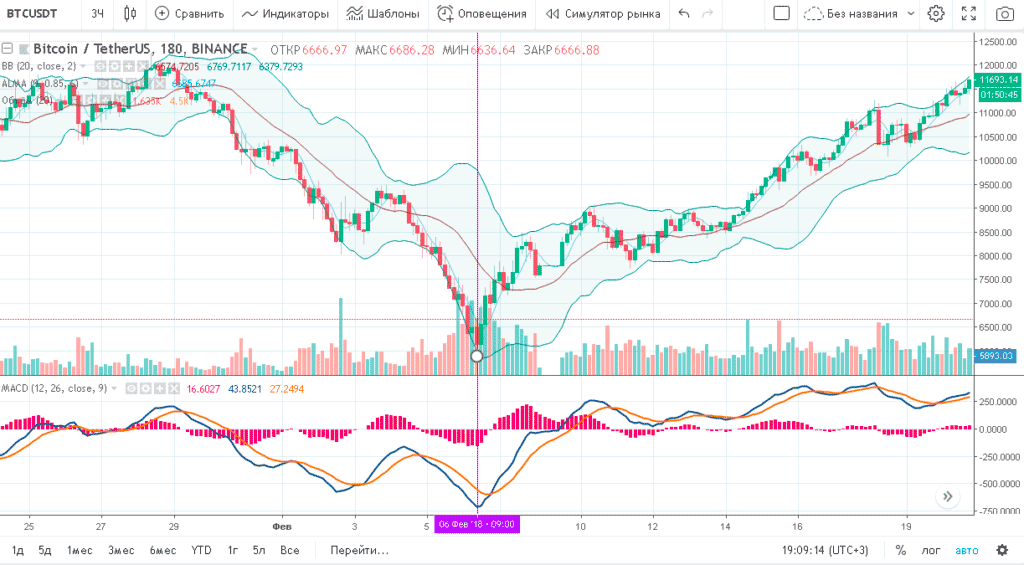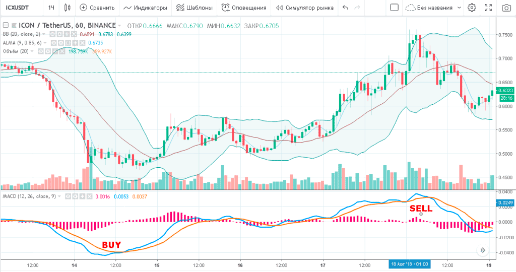 Внимание! Используйте индикатор MACD вместе с RSI, SMA и Лентами Боллинджера, поскольку MACD не может предоставить Вам 100% гарантию и порой дает ложные сигналы. Рассмотрим три графика, на которых индикатор MACD сработал и дал возможность закупиться криптовалютой на дне и продать ее на пике