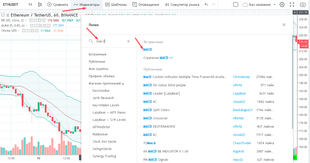 Нажимаем на Индикаторы и в поиске вводим “MACD” для его активации. В настройках копаться не нужно, оставим все как есть.