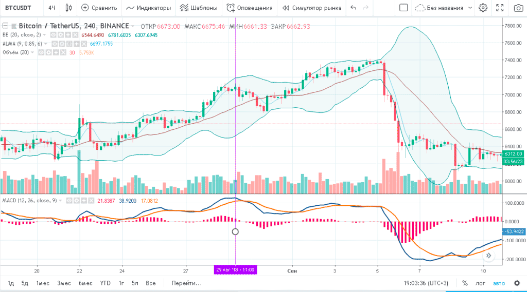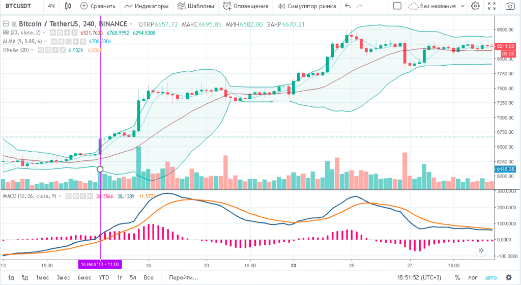 Для примера рассмотрим пару BTC/USDT с 4-часовым таймфреймом. 16 июля 2018 года линия MACD началась уходить от линии Signal, что в свою очередь сигнализировало о формировании бычьего тренда.