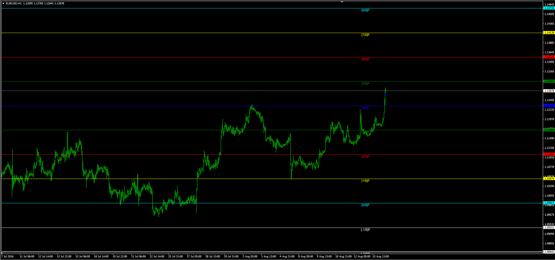 Мюррей советовал для дневного таймфрейма период, равный 64. Он очень хорошо подходит под динамику многих финансовых инструментов. Для меньших таймфреймов тоже можно использовать такой период, но пропорционально пересчитанный. Например, для таймфрейма H1 – 64*24=1536. Таким образом, задав период равным 1536, можно на часовом ценовом графике увидеть расположение сильных дневных уровней Мюррея.