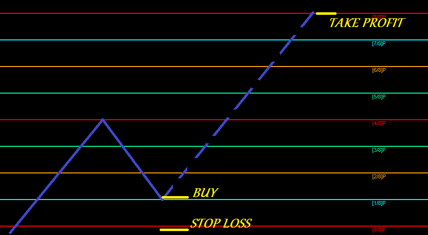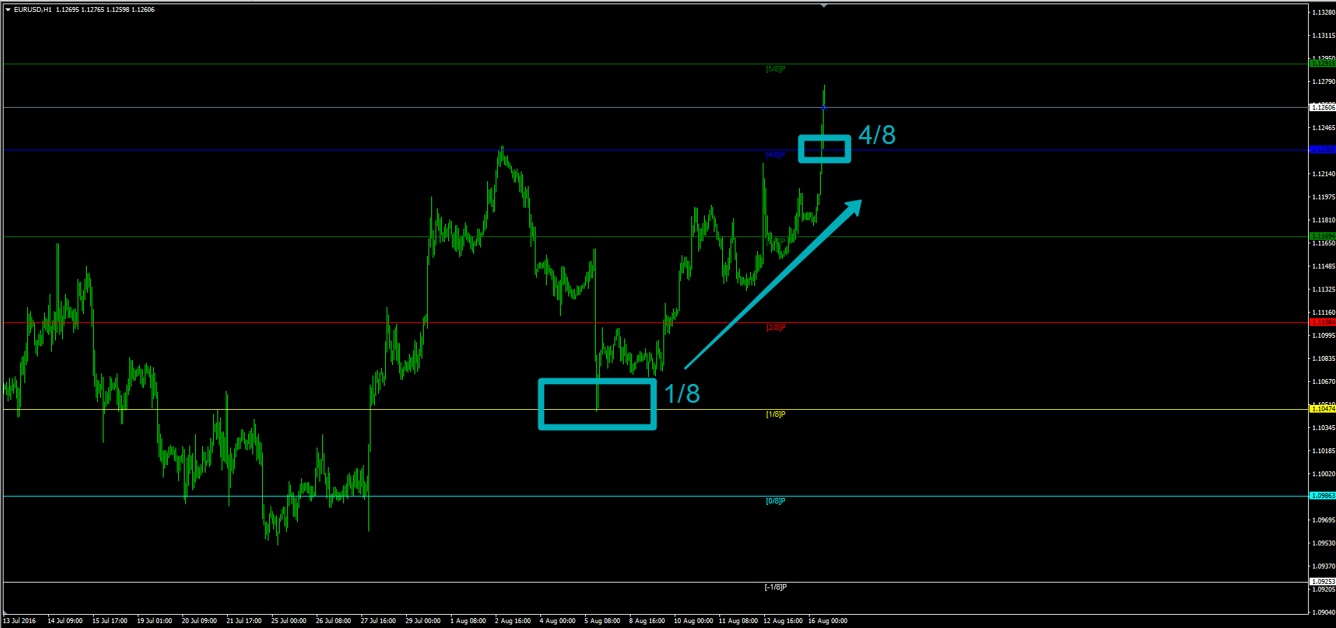 Как уже наверно понятно из названия, этот паттерн образуется движением цены от уровня 0/8 к уровню 4/8, затем откатом к уровню 1/8 и продолжением движения уже до уровня 8/8.