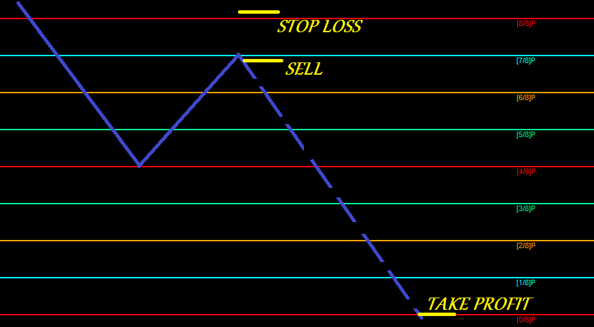 Торговля по нему осуществляется аналогичным образом. После того как произойдёт откат цены от уровня 4/8 к уровню 7/8 и сформируется разворот вниз у уровня 7/8, открывается позиция на продажу (SELL).