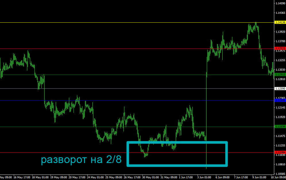 - 2/8 и 6/8 – линии средней силы, могут использоваться как источник разворотных сигналов. При умеренных движениях и средней волатильности график может не доходить до окончательного сопротивления /поддержки и разворачиваться от 2/8, 6/8.