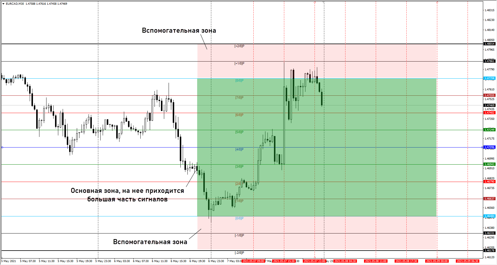 Границы основного торгового диапазона. Это место консолидации, в которой валютные пары проводят большую часть торгового времени. Для трейдера это время ожидания ― новые ордера здесь не открывают. Когда 5/8 или 3/8 пробиты, ожидают появления направленного движения в этом направлении. Целью в таком случае выступают 8/8 и 0/8.