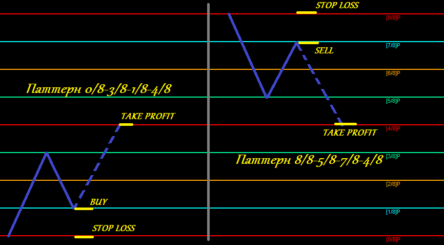 Кроме этого, иногда выделяют два паттерна меньшего размера (в половину от описанных выше). Это паттерны 0/8-3/8-1/8-4/8 (бычий) и 8/8-5/8-7/8-4/8 (медвежий). Торговля по ним полностью аналогична, а потому дублировать её описание я здесь не буду. Взгляните на картинку ниже.